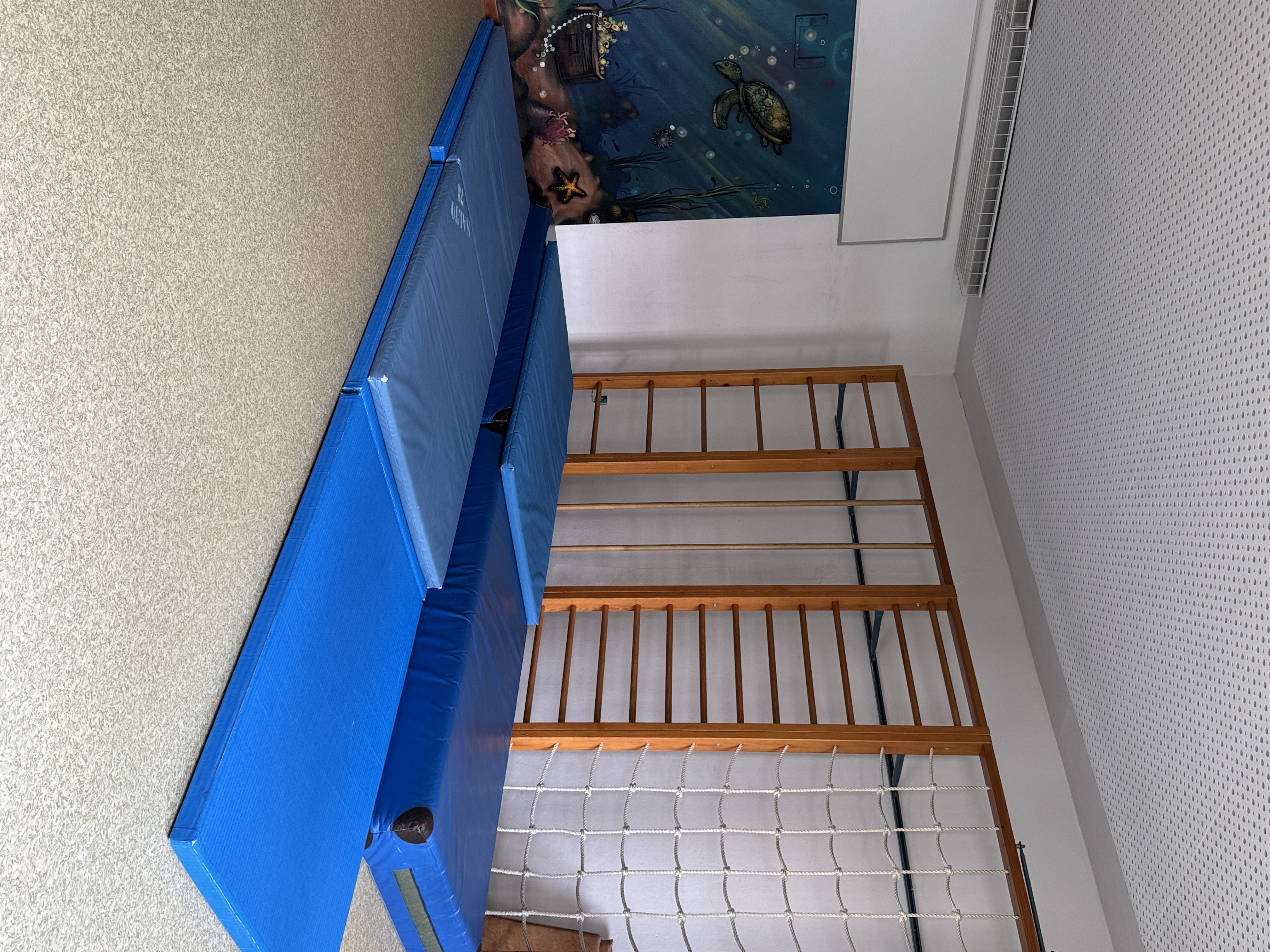Unser Bewegungsraum ist mit einer fest installierten Sprossenwand und frei beweglichen Gegenständen wie Kriechtunnel, Bälle, Kästen in verschiedenen Größen, Hüpfpferde, Rutsche, Hängematte, Schaukel, Wippe sowie Fahrzeugen ausgestattet. Diese Materialien fordern die Kinder zu unterschiedlichen Bewegungsabläufen heraus und unterstützen die Entwicklung ihrer Bewegungsfertigkeiten.